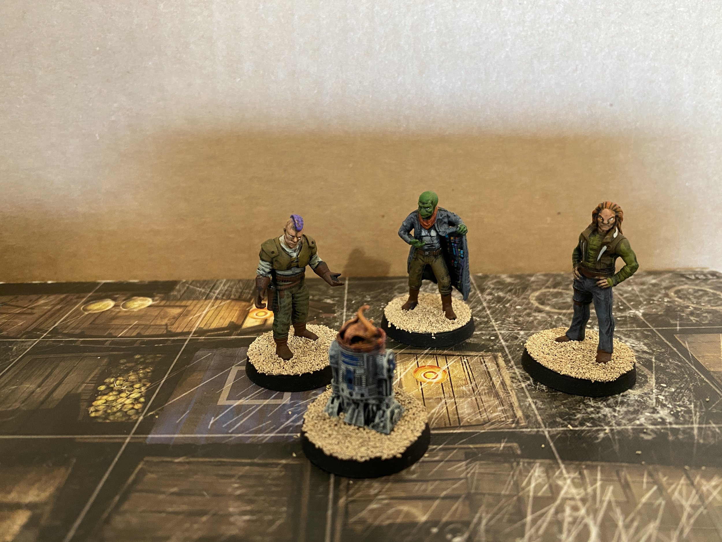 Most of this week was spent painting 3d-printed Star Wars figures by Modest Minis Studio and OmniForged… a few civilians, several bad actors (bounty hunters and smugglers), and a nice group of urban security agents. The agents still need their bases covered with Woodland Scenics buff ballast. However, I began the week painting two Inspire Miniature hags… just for a change of pace.