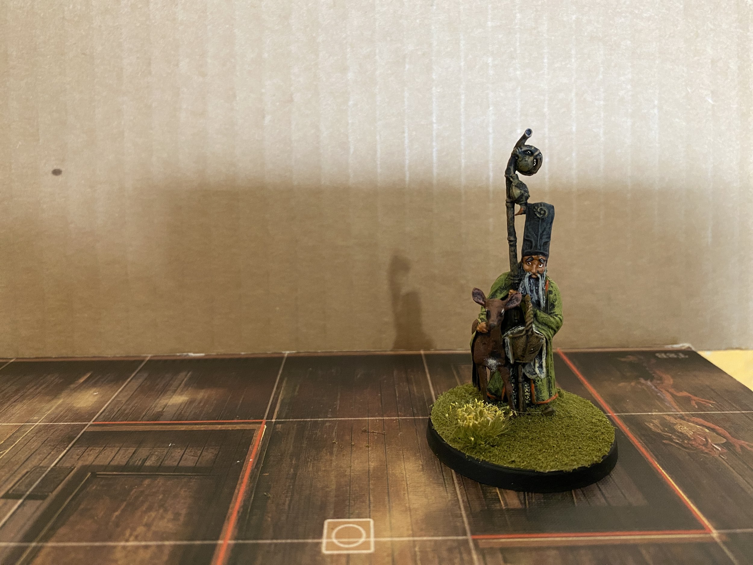 With those done I turned my attention to the last three figures I have from CMON’s The World of Smog/The Rise of Moloch: Elisabeth Sparkle, Shamock The Great, and The Prestigious Cabinet. I hadn’t done these earlier because I was waiting for some candles from Tiny Furniture. The Prestigious Cabinet offered the only complication. That arose from the fact that I had been thinking of it in terms of the concept art rather than the reality of the figure itself. In the concept art, the woman in the box has long, flowing hair. The actual figure seems to be wearing some kind of skull cap over her hair… no long and flowing hair to be seen. I like the long and flowing hair, so I hunted through my Heroclix figures and found the hair I wanted on Madame Xanadu. I cut the hair off that figure, did some slight modification of the skull cap on the CMON figure, and glued the Heroclix hair in place. Much better.
